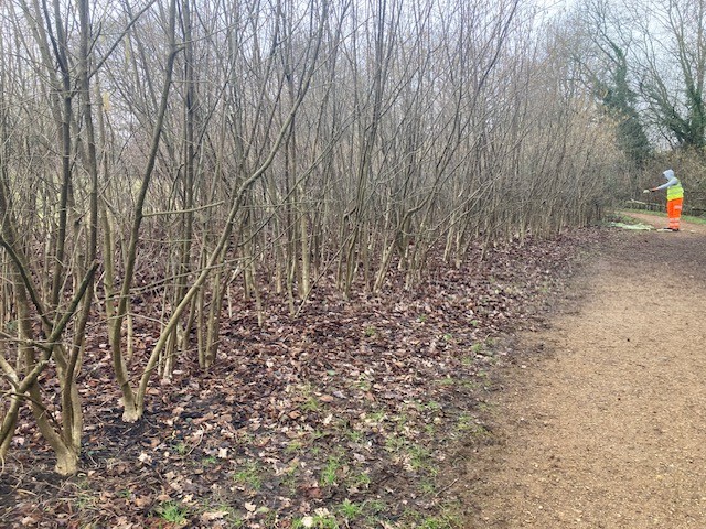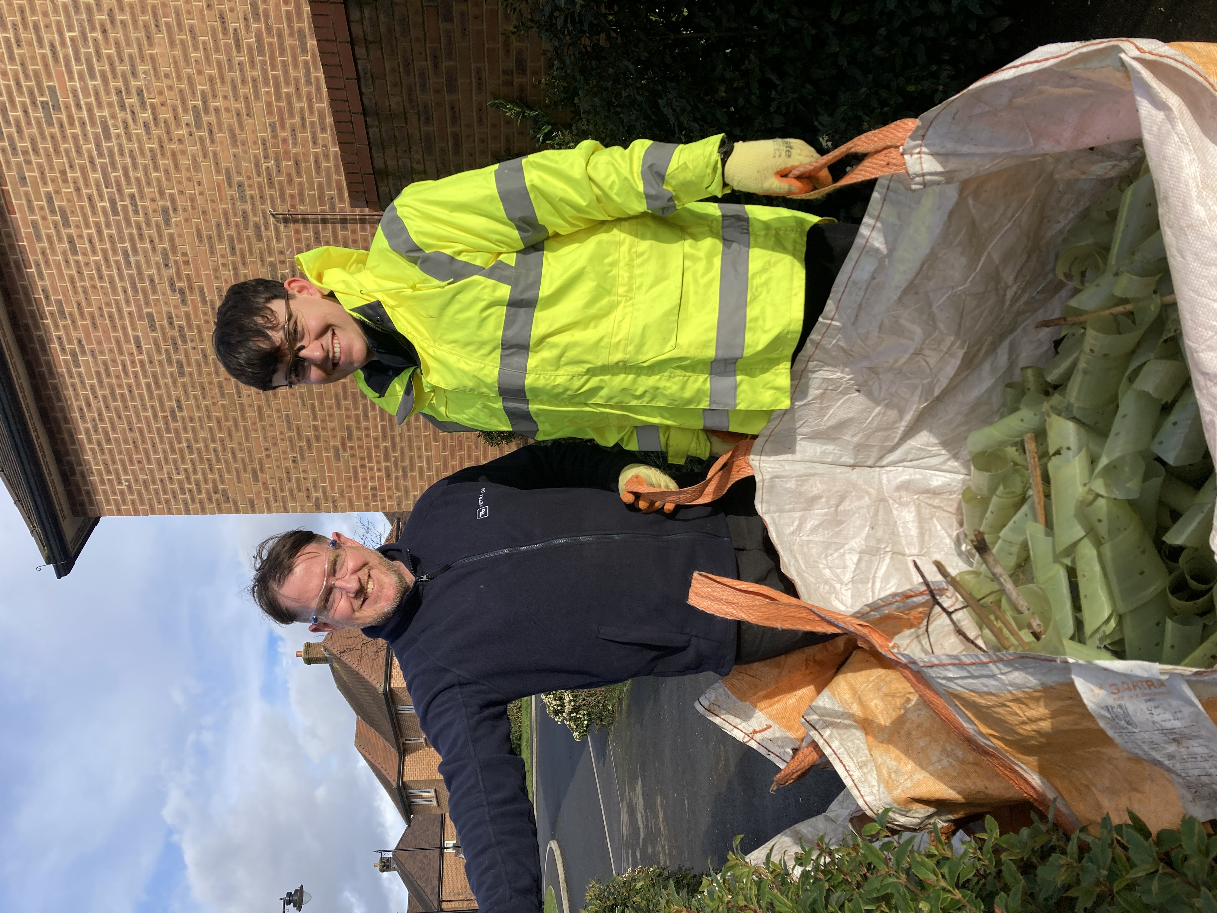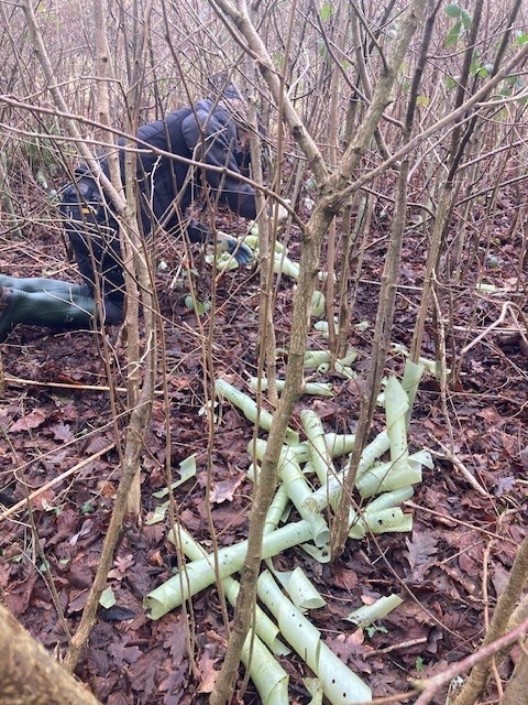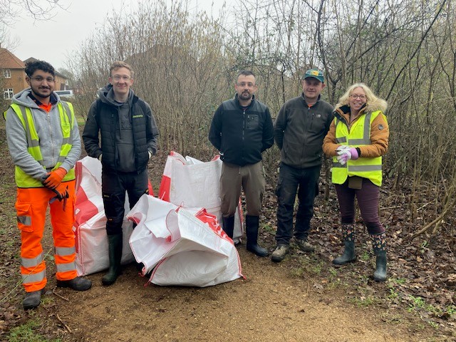 In January and February two of our supply chain partners Harmonix Construction and Tetra Tech volunteered for two afternoons clearing the tree guards that had been in place for almost ten years adjacent to the large balancing pond in Oak Vale. Tree guards are put in when new trees and shrubs are planted in an area to protect them from the elements and wildlife. These tree guards are made of a non-biodegradable plastic so it’s important to remove these when the trees and shrubs reach maturity. The images show how much better the area looks, with the plants having more space to grow and the wildlife having a safer area in which to nest and feed. The plan is for the Town Park Phase 2 works to have degradable tree guards where possible in the planting areas.